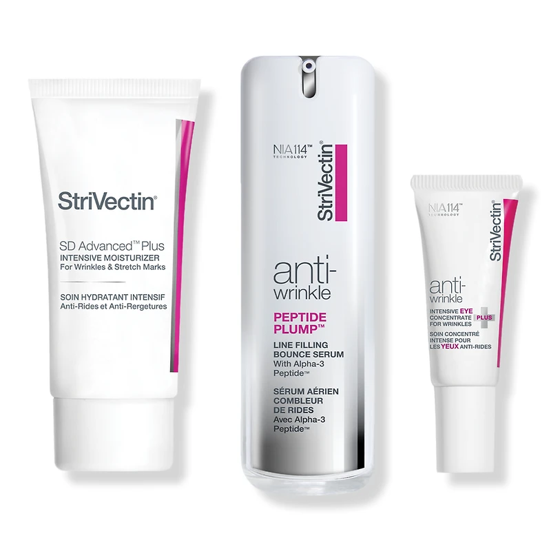 DISCOVERY SERIES ANTI WRINKLE TRIO 1.0OZ. Features: INTENSIVE EYE CONCENTRATE FOR WRINKLES PLUS (0.25 oz) Moisturizing yet fast-absorbing eye cream reduces the look of fine lines, dark circles and puffiness. Ophthalmologist tested and fragrance free.. PEPTIDE PLUMP LINE FILLING BOUNCE SERUM (0.5 oz) The 'no filler' line filling serum targets skin's natural collagen, elastin, and hyaluronic acid for intense line-smoothing power.. SD ADVANCED PLUS INTENSIVE MOISTURIZER FOR WRINKLES & STRETCH MARKS (1.0 oz) Targets collagen loss to significantly improve the look of fine lines and wrinkles. Formulated Without: Parabens. :
