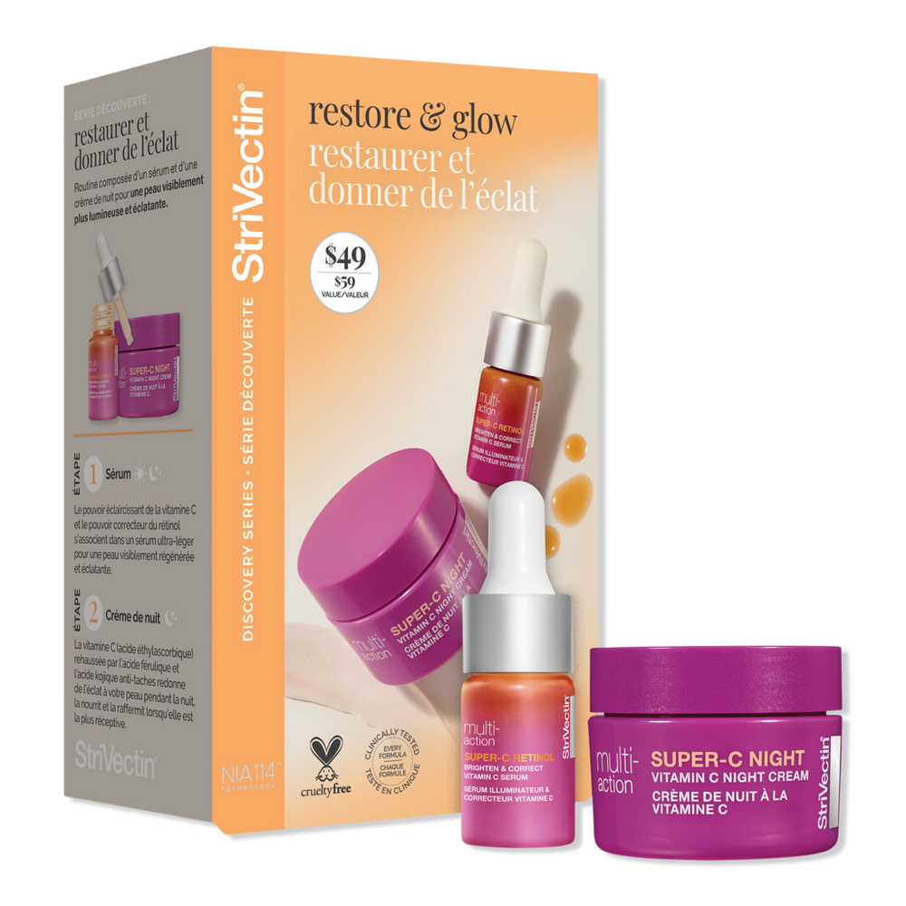 SUPER C DISCOVERY SERIES DUO KIT. Benefits: Super-C Retinol & Vitamin C Serum restores radiance and clarity to dull, tired skin while smoothing away fine lines and uneven texture. Super-C Night Vitamin C Cream helps reduce the look of discoloration and fades dark spots on the face as well as replenishes lost moisture overnight. Illuminating Microspheres: Neutralize dark circles and blur imperfections. Retinol: Smooths rough, uneven texture, and fine lines. L ascorbic acid with an optimized delivery system so skin looks brightened, firm, and more even. Includes: Super-C Retinol Brighten & Correct Vitamin C Serum (0.25 oz). Super-C Night Vitamin C Cream (1.0 oz). :