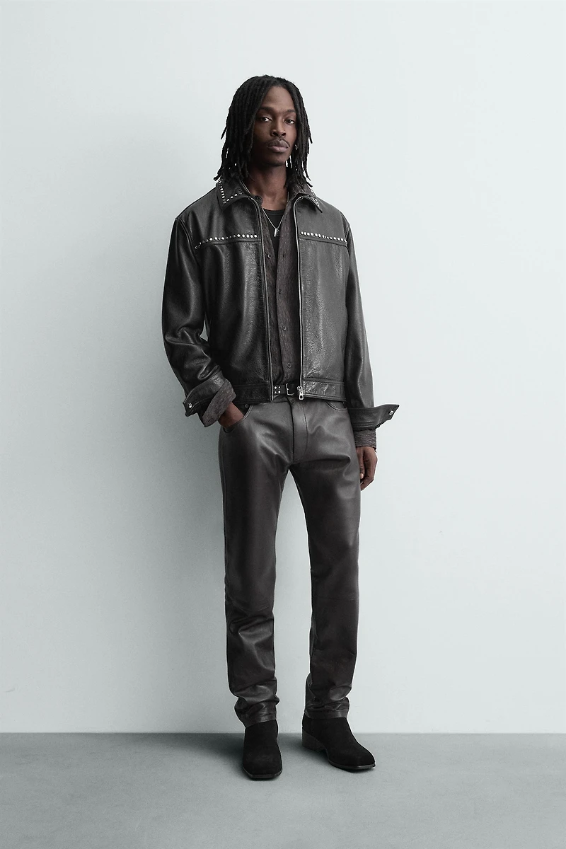 Textured leather relaxed fit jacket. Lapel collar and long sleeves with buttoned cuffs. Contrasting metal stud detail. Front zip closure.