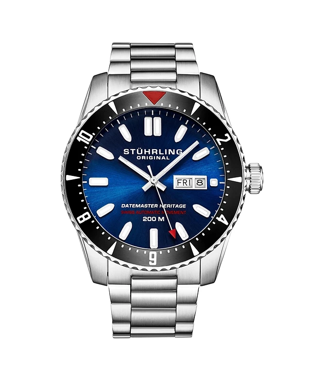 Stuhrling Men s Aquadiver 44mm Swiss Automatic Diver Watch, Blue Dial, Stainless Steel Bracelet, Day-Date, 200M Water Resistant