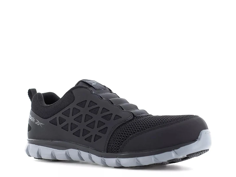Experience impressive lightness and flexibility with the Reebok Work Sublite Cushion Composite Toe work slip-on. It has a Sublite foam midsole, featuring deep flex grooves that reduces weight and enhances your range of motion. Rubber pads at the heel and forefoot offer traction without adding extra weight. Anti-scratch properties ensure your work environment remains free of shoe markings. The MemoryTech Massage 2.0 footbed adapts to the unique contours of your foot for personalized comfort. Composite toe and ESD rating keep you safe against electrical hazards.