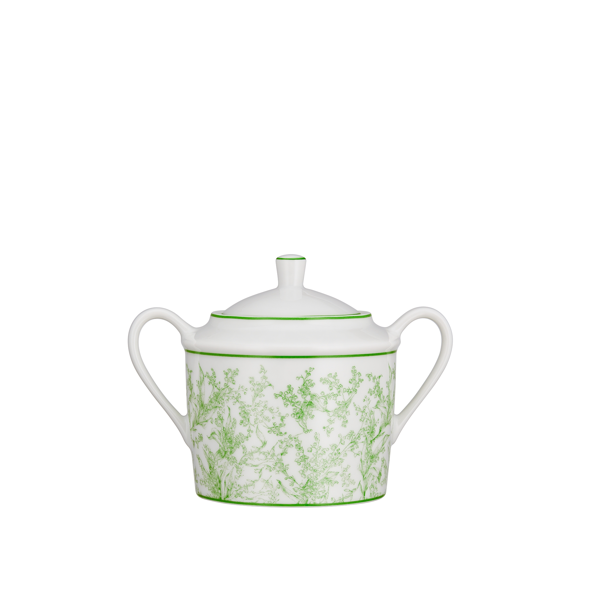 The white Limoges porcelain sugar bowl features the green Lily of the Valley motif. Designed by Cordelia de Castellane, the motif pays tribute to art de vivre, good fortune and the gentle celebration of nature. Mr. Dior was passionate about flowers and chose the lily of the valley as one of his lucky charms. A symbol of purity and joy, the lily of the valley heralds warmer days to come and adorns the sugar bowl.