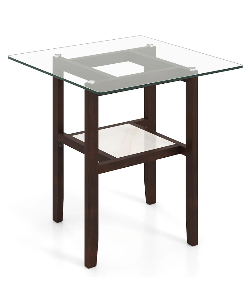 Create a clean, modern focal point in your living room with this 24-inch 2-tier square glass coffee table. The clear glass tabletop offers an open look that pairs well with a variety of decor styles, while the lower shelf adds convenient space for books, baskets, remotes, and everyday essentials to help keep your room organized. Built with a rubber wood frame and a supportive lower shelf, this center table is designed for everyday use and a balanced feel. Adjustable foot pads help the table sit more evenly on different floor surfaces. The smooth glass and shelf surfaces make routine cleanup simple, and the raised legs help make it easier to access the floor underneath.