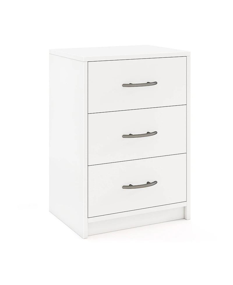 Keep small-space essentials neatly organized with this compact 3-drawer nightstand designed for bedrooms, living rooms, or reading corners. A wide tabletop provides a convenient spot for a lamp, books, decor, or a drink, while three drawers offer tidy, out-of-sight storage for everyday items. Built from engineered wood with a stable base and floor-friendly foot pads, it s designed for steady daily use and easy placement beside a bed or next to a sofa. Clean lines and a simple white finish help it blend into a variety of decor styles, making it a practical accent piece for apartments, guest rooms, or tight corners.