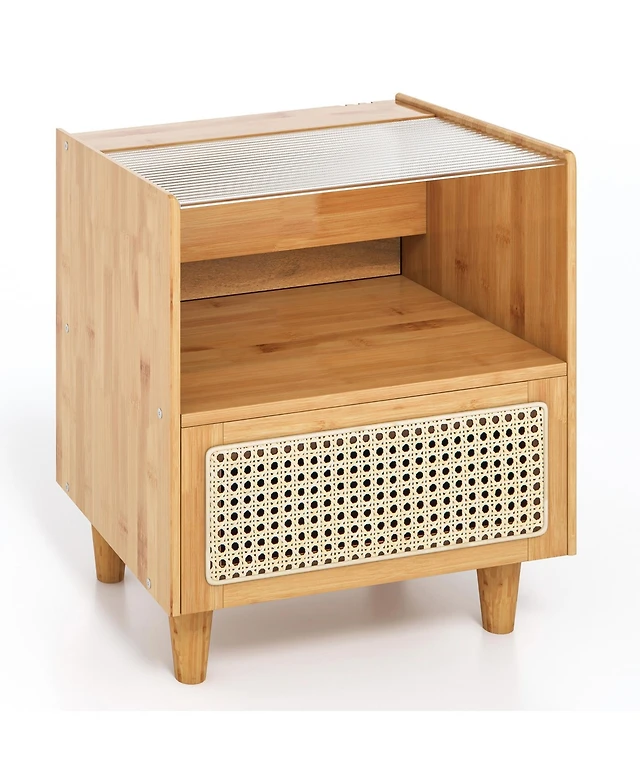 Gymax Rattan Nightstand Boho End Table with Drawer & Open Shelf for Living Room