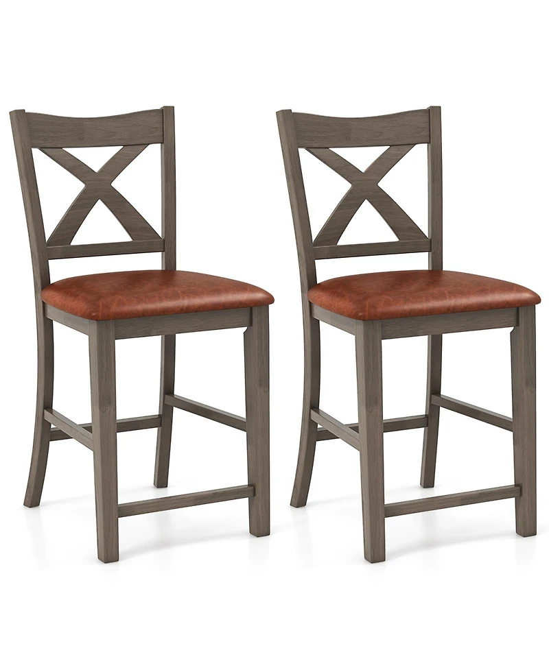 Add classic farmhouse charm and everyday comfort to your kitchen or dining area with this set of two cross-back bar stools. Built with a solid rubber wood frame in a warm wood-grain finish, each stool offers dependable support for daily meals, casual gatherings, and entertaining. The upholstered seat combines cushioned sponge padding with a smooth faux leather surface for a comfortable place to sit, while the gently reclined backrest and integrated footrest help you relax during longer conversations. The cross-back design adds timeless character and an airy look that pairs easily with a range of decor styles. Each stool measures 20"" x 19"" x 39"" and is designed to work well with 35""-39"" counter-height surfaces, with a 290 lb weight capacity per stool.
