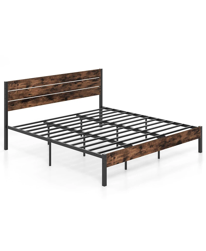Bring industrial style and strong everyday support to your bedroom with this king size platform bed frame featuring a tall slatted headboard and a heavy-duty metal foundation. Twelve metal slats plus a built-in mute bar help minimize movement and keep the frame stable for a quieter, more comfortable night. With 12.5 inches of clearance underneath, it creates valuable storage room and makes it easier to clean under the bed. The snap-lock slat design helps simplify assembly, while anti-slip foot pads help keep the frame steady and protect your flooring. Designed for use with an 8 to 12 inch mattress, this platform frame eliminates the need for a box spring.