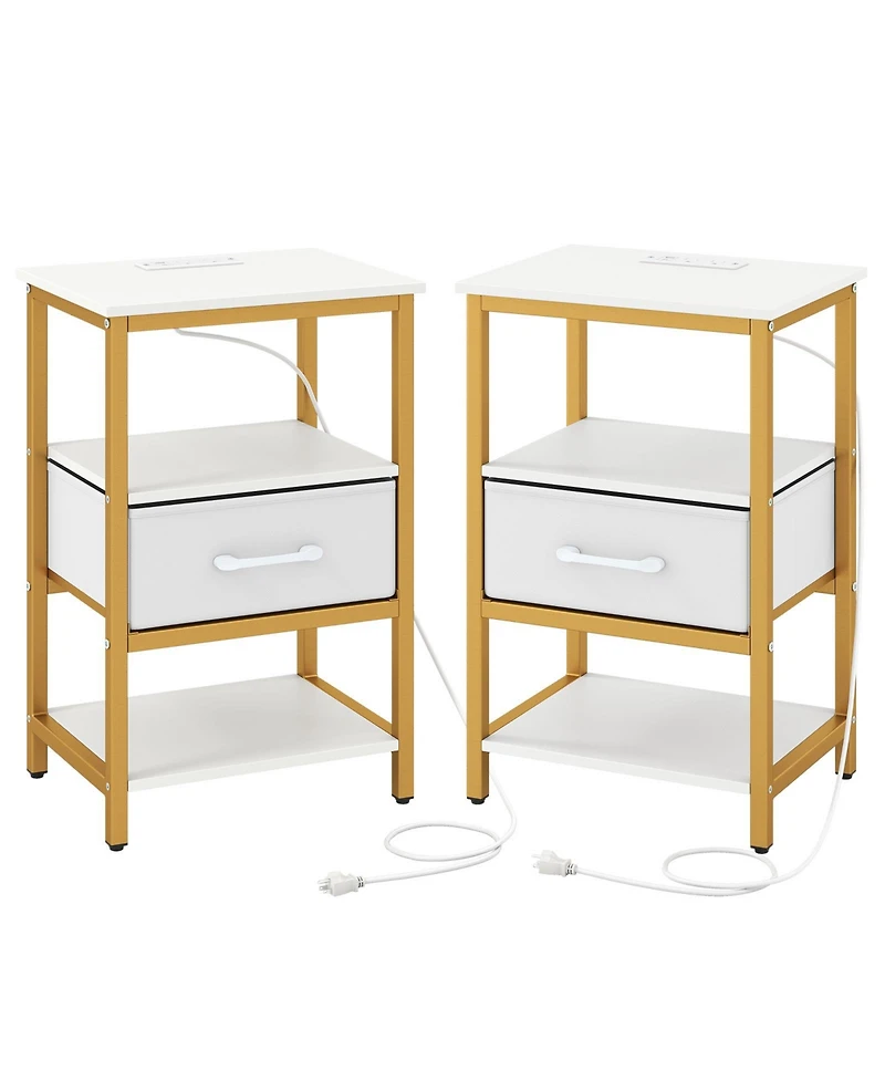 Keep your bedside or sofa-side essentials organized and powered with this nightstand featuring a built-in charging station and a flexible fabric drawer. Two Ac outlets plus Usb and Type-c ports make it easy to charge phones, tablets, and small devices within reach, while the 4.8 ft cord provides convenient placement options. Designed for everyday organization, it includes a practical tabletop and two open shelves for books, decor, and frequently used items. The fabric drawer can be positioned in three different heights to match your storage needs and is easy to set up or remove. Finished with a clean white surface and gold-tone accents, and supported by a sturdy metal frame with adjustable foot pads, this end table adds modern function to bedrooms and living rooms.