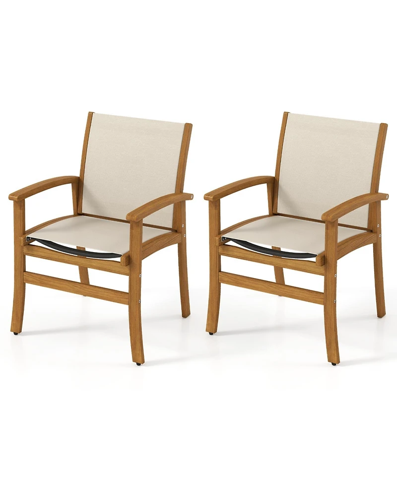 Enhance your outdoor dining with these stylish patio chairs, featuring breathable fabric for comfort in warm weather. Built on a durable acacia wood frame, they offer ergonomic support with curved armrests and a 105degree(s) seating angle. Reinforced for stability, they are perfect for any patio, garden, or poolside setting.