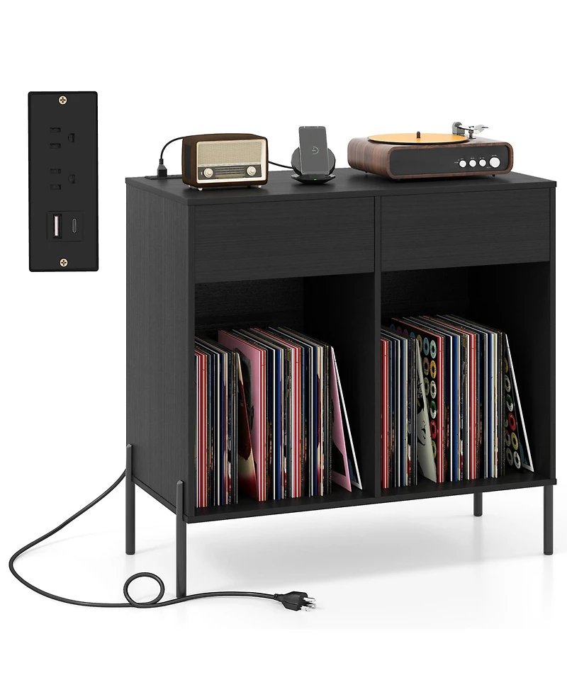 Upgrade your music setup with this double-wide record player stand that blends vinyl organization, accessory storage, and built-in charging in one streamlined piece. The wide 31.5" tabletop offers a stable surface for your turntable, while two smooth-glide drawers keep cables, sleeves, and small items neatly tucked away. Two open compartments with removable dividers let you customize vinyl storage and easily flip through your favorite albums, and a rear cable hole helps keep cords organized. Raised metal legs lift the cabinet 6" off the floor for a lighter look and easier cleaning, with non-slip foot pads to help reduce floor scuffs. Designed for everyday use in living rooms, bedrooms, or entryways, it pairs clean lines and wood-grain style with practical function. Includes a built-in charging station with two outlets plus Usb and Type-c ports, and a 4.8 ft power cord.