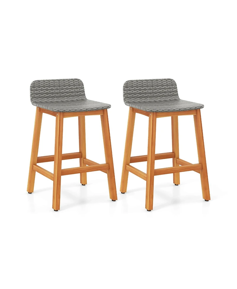 Elevate your porch or patio seating with this set of two solid acacia wood bar stools designed for comfort and outdoor style. Each stool features a supportive backrest, curved armrests, and a built-in footrest to help you settle in for relaxed meals or casual conversations. The seat is wrapped in Pe rattan that's made to handle outdoor conditions with a sun-resistant, easy-care surface, while the acacia wood frame showcases visible grain for a warm, rustic look. With a 26"" seat height and strong 400 lb weight capacity per stool, these bar stools are a sturdy, good-looking choice for balconies, porches, and backyard bar setups. For best long-term performance, oil the wood periodically.