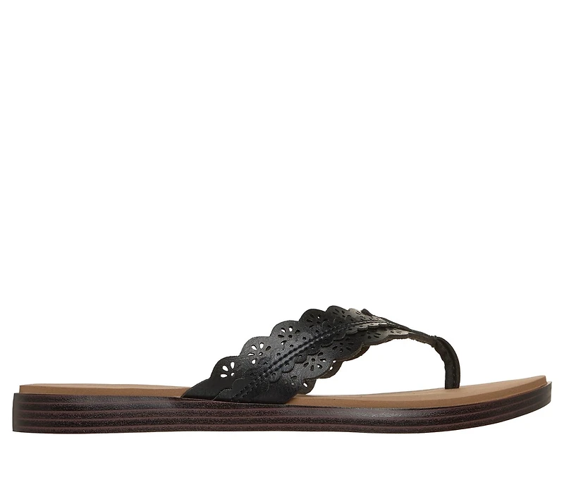 Soak up sunny-weather days in style with Skechers Summer Cove - Catching Sun Too! This flip flop sandal features a scalloped vegan leather upper with floral cutouts and a Luxe Foam® cushioned comfort footbed.