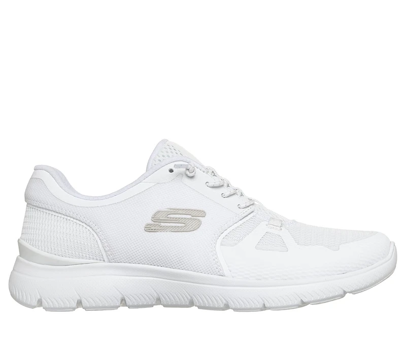 Happier feet are just a step away with Skechers Summits - Steady Flow. This casual vegan design features a mesh and hotmelt overlay upper with tied-off stretch laces and a cushioned Skechers Memory Foam™ comfort insole.
