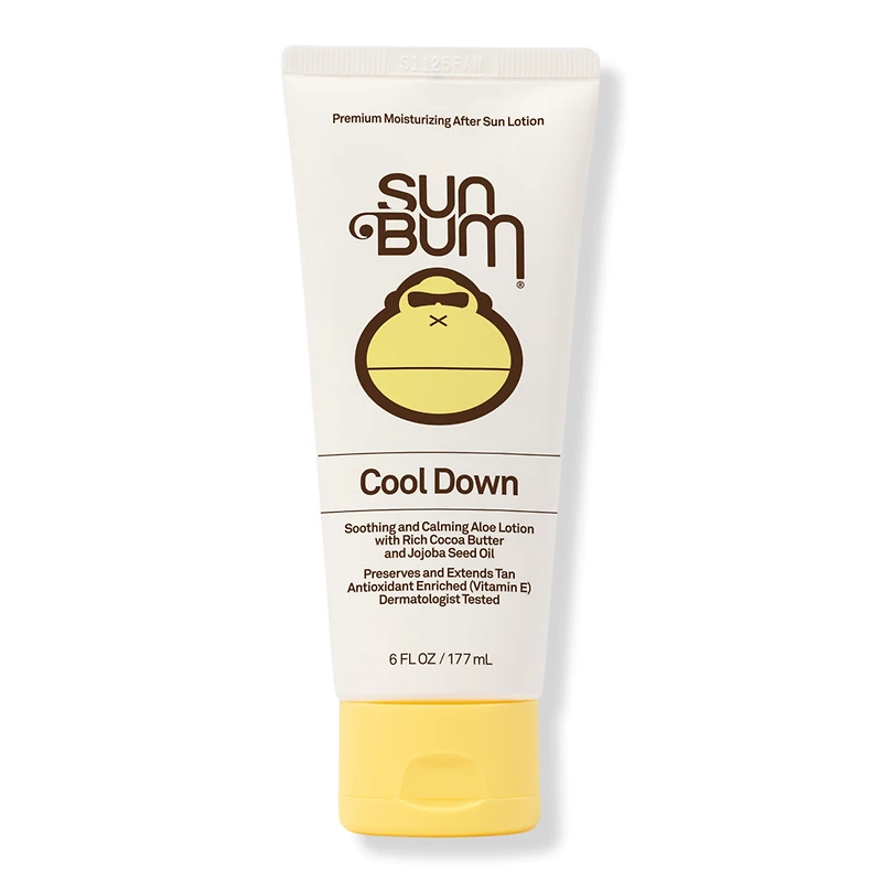 AFTER SUN COOL DOWN LOTION. Benefits: Light, non-greasy formula is quickly absorbed, leaving the skin smooth and soft. Sun Bum likes to prevent sunburns, but if you get one, this soothing Aloe lotion is a lifesaver.. Features: Gluten Free. Key Ingredients: Vitamin E: An antioxidant that helps to neutralize free radicals, which are the main cause of premature skin aging. Aloe: An emollient tropical extract that calms and soothes sensitive skin. Cocoa Butter: A protective, skin moisturizer from Cocoa beans.