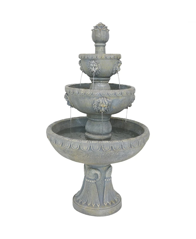 Add a regal yet relaxing touch to any outdoor space with this 3-tier fountain. Designed to look like real stone but much more durable, this fountain is sure to last through many seasons. Whether placed in the yard, garden, patio, deck, or front porch, this masterpiece will get noticed and be appreciated by all who view it. The fountain features 3 tiers. The larger lower tier has a diameter of 29"" and is 7.5"" deep. The middle tier has a 19.25"" diameter and is 6.5"" deep and the top tier has an 11.5"" diameter and is 5.5"" deep. Plus, the gentle sounds of the flowing water down the 3 tiers circulate back to the top effortless to create a soothing atmosphere that is sure to make a statement. Just set where you'd like it to go, fill with water, plug in to a standard electrical outlet, and watch the outdoor space transform into a relaxation hot spot.