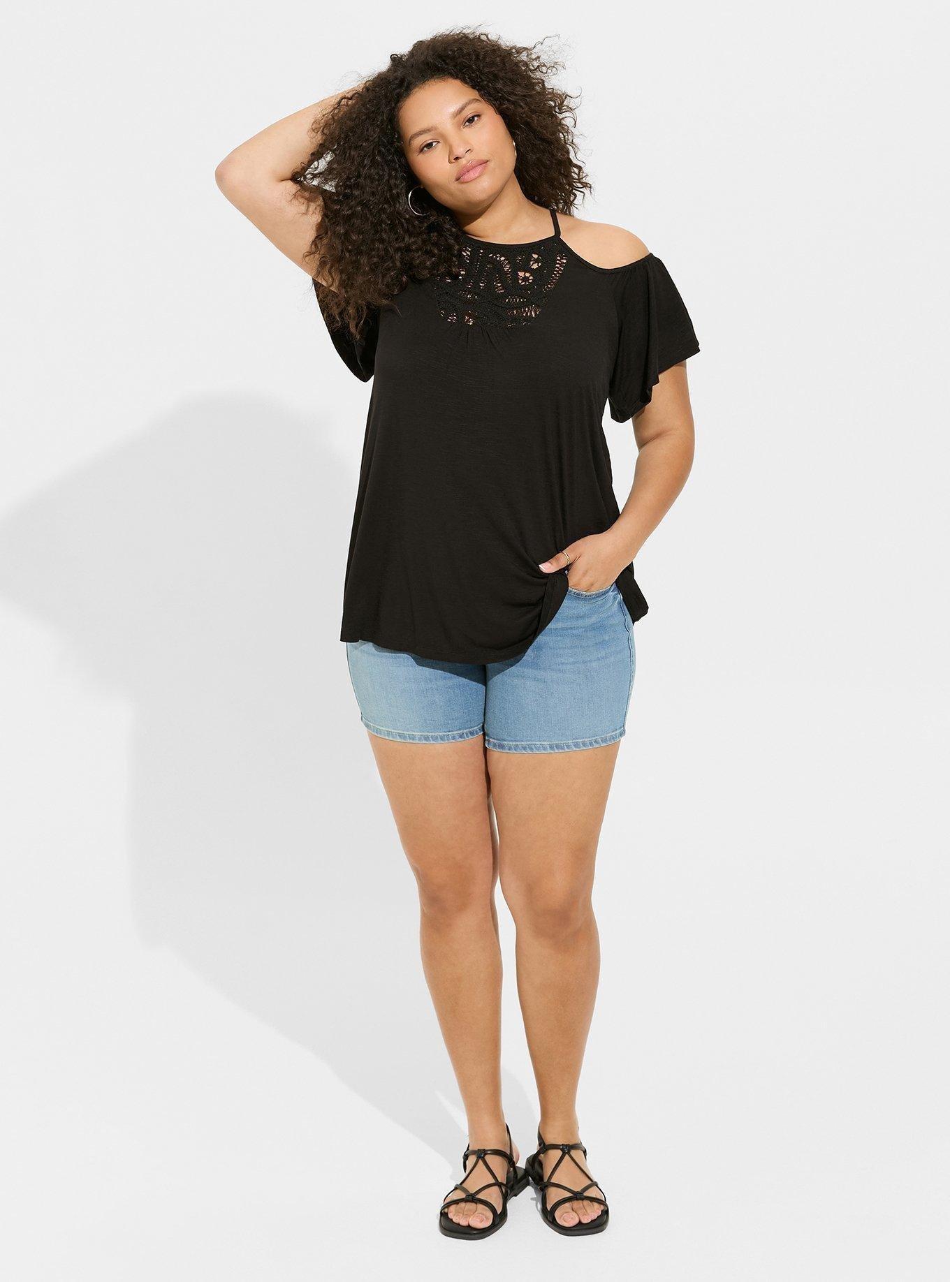 Super Soft Slub High Neck Crochet Cold Shoulder Top in Bloomington, MN