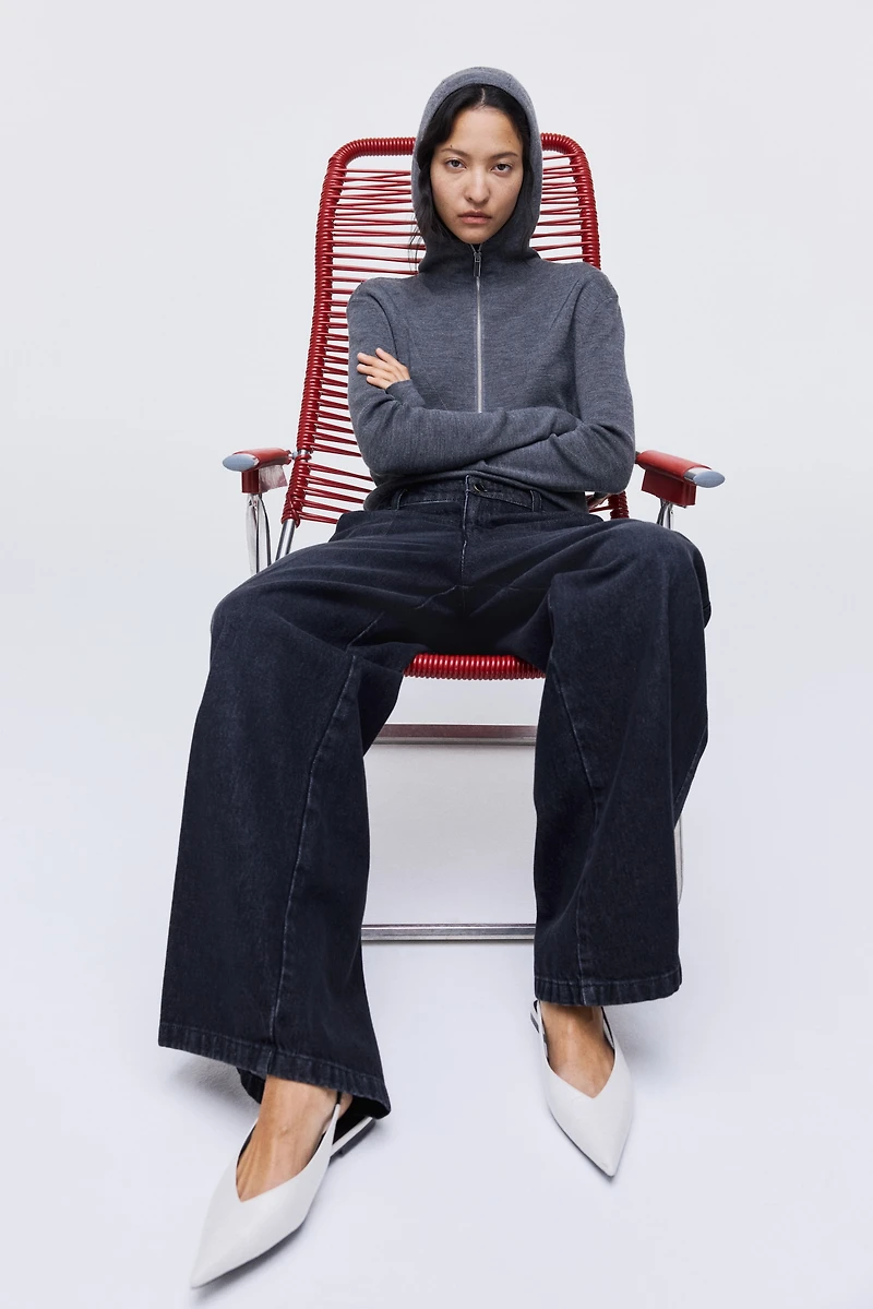 Jeans in rigid cotton denim that feels firm at first, softening and relaxing with wear. Loose fit from waist to hip and extra-wide cut from thigh to hem. High waist and zip fly with button. Diagonal side pockets, patch back pockets, and creases at front and back. Wide, regular-length legs, designed to fall at top of foot with little or no stacking. Inspired by the 70s, designed for today.