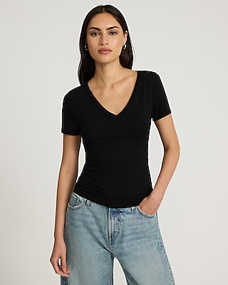 A classic fitted tee complete with short sleeves, a v-neckline, and a supersoft double layer of fluid jersey fabric.