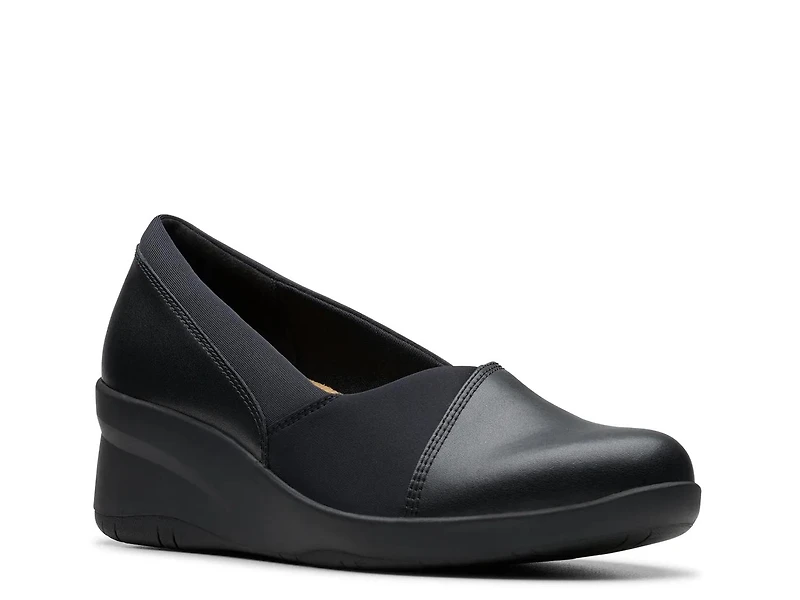 The Clarks Suttyn Walk wedge slip-on is perfect to pair up your office or evening attire. Leather upper offers a premium touch to this slip-on that comes with Ultimate Comfort synthetic foam footbed to pamper your feet with each step. The flexible synthetic outsole with tread pattern offers a reliable grip.