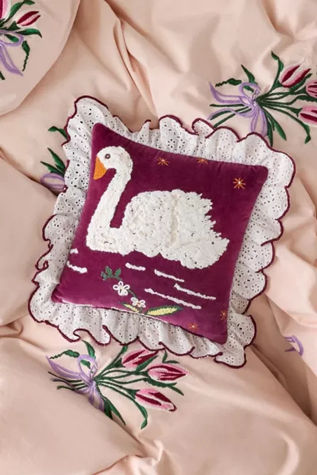 Swan Embroidered Ruffle Velvet Throw Pillow