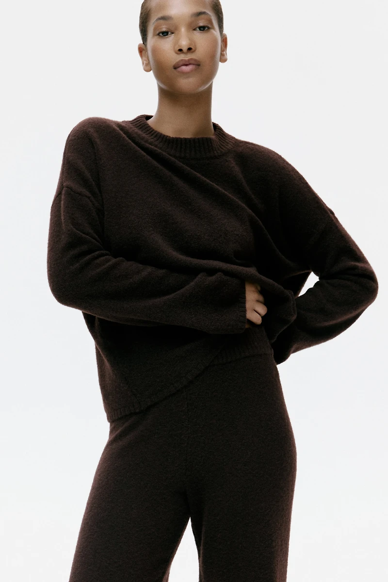 Soft, knit sweater. Round, ribbed neckline, heavily dropped shoulders, and long sleeves. Narrow ribbing at cuffs and hem.