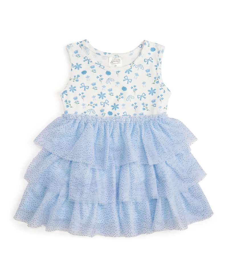 This darling dress combines a sweet, soft printed top with three dazzling layers of blue tulle, making every twirl a magical moment.