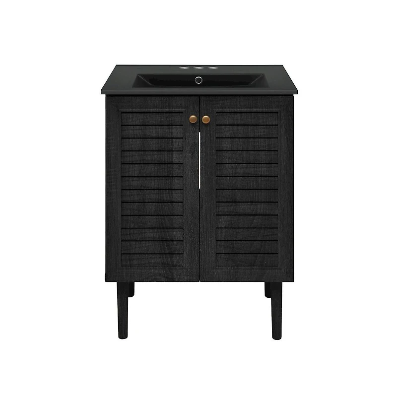 Celebrate the allure of bronze in the Bron collection, where metallic accents and modern elements converge. Tailor your bathroom to perfection with our cabinets-only vanities, offering customizable vanity top solutions to integrate with your design vision. Offered in black oak with a matte black sink top.