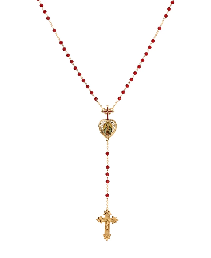 This rosary necklace features deep red beads linked by 14k gold dipped chain, creating a bold and meaningful design. At its center is an ornate heart medallion with an image of Our Lady of Guadalupe, paired with a small red enamel cross.
