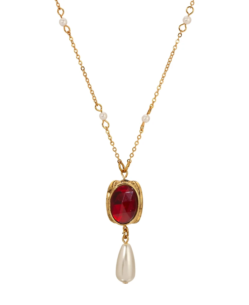 This unique necklace features a three-sided rotating pendant showcasing a rich red faceted stone, a sacred image of the Virgin Mary, and a depiction of Mary with Child. The pendant is accented with a graceful teardrop faux pearl drop, adding a touch of softness to its vibrant centerpiece.