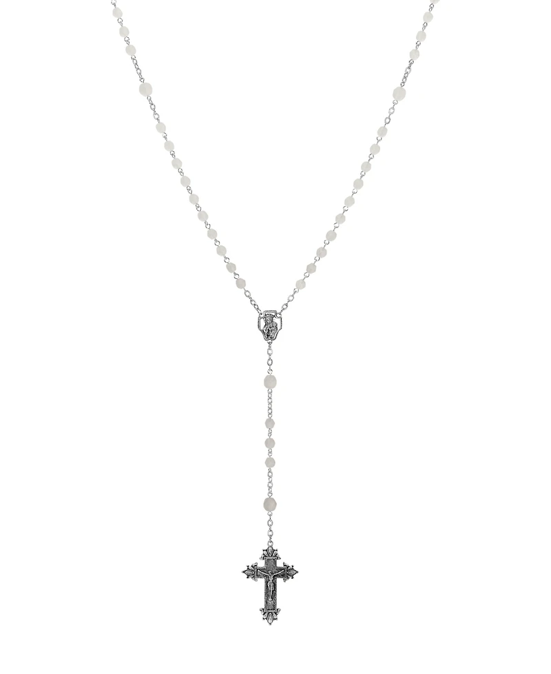 Symbols of Faith Silver-Tone Frosted Beaded Crucifix Rosary Necklace
