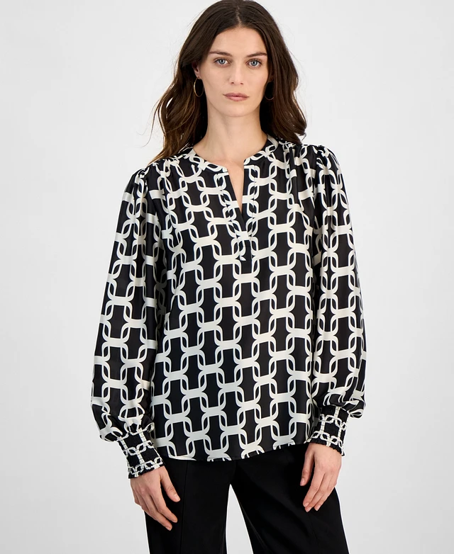 T Tahari Women's Printed Long-Sleeve Satin Split-Neck Top
