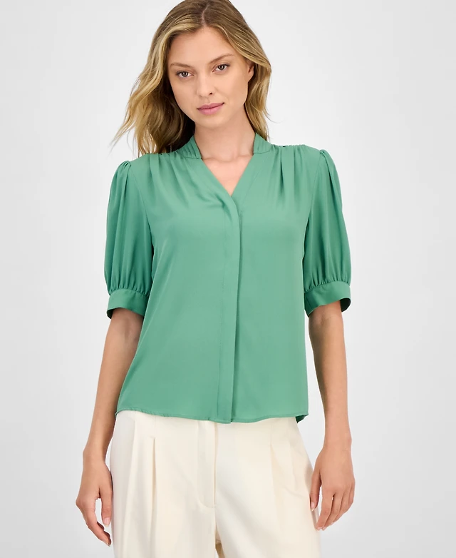 T Tahari Women's Split-Neck Covered-Placket Woven Top