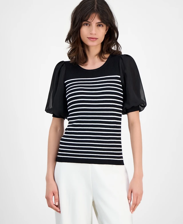 T Tahari Women's Striped Puffed-Sleeve Ribbed Top