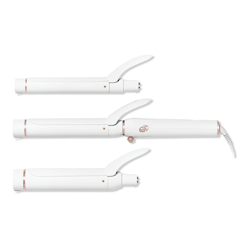 SWITCH KIT CLASSICS TRIO. Features: Twist & Switch Design: Makes switching barrels a breeze. TightTwist Lock: Holds barrels securely in place and doubles as a stand for secure styling. 1" Clip Barrel: Creates classic curls or textured waves. 1.25 Clip Barrel: Creates soft, lived-in curls and waves. 1.5 Clip Barrel: Creates big, voluminous curls and waves. T3 Rapid HeatIQ Technology: Ensures perfect heat precisionno hot or cool spotsfor fast styling with lasting results. Ion Generator: Minimizes static frizz, boosts shine, and locks in style. CeraGloss Ceramic Barrels: Glide effortlessly for smooth, shiny results. Lightweight Design: Lightweight and ergonomic. No heavy lifting required. Cool Tip: Cool handling for ultimate styling control. Silicone Footer: Protects your countertop and keeps tool stationary while you style. Hidden Hinge Clip Lever Design: For a smooth, snag-free glide. Auto World Voltage: For use around the world. 1 Hour Auto-Off: For safe styling and peace of mind. 360-Degree Swivel Cord: For zero twisting, zero tangling, and easy maneuvering while you style. Research Results: 96% achieved smoother, shinier curls*. 94% say it styles faster than their previous iron*. 93% experienced long-lasting results*. *Based on a third-party panel study of 106 participants. :