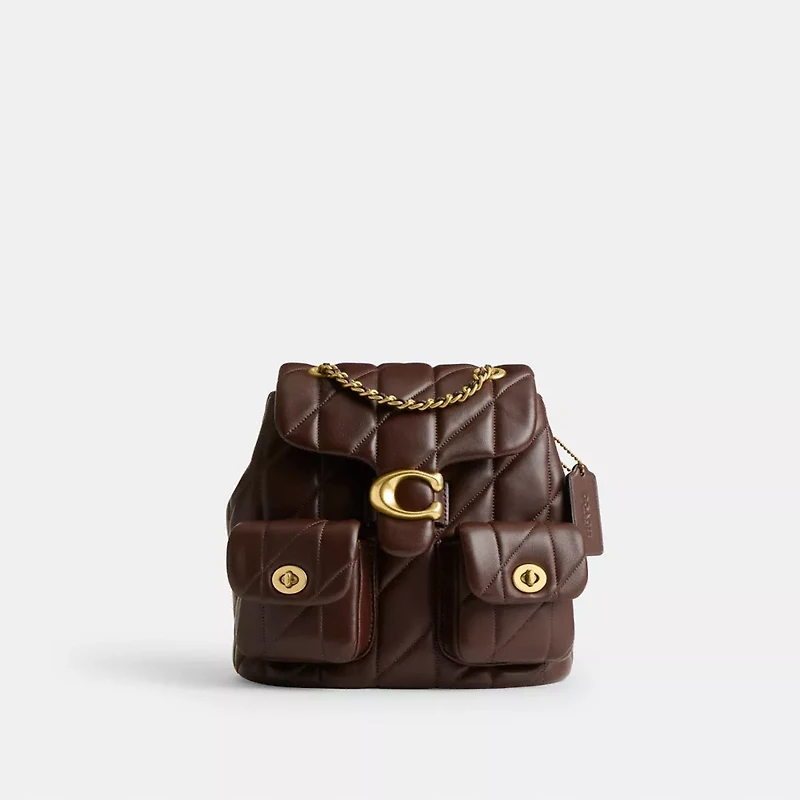 A modern take on an archival 1970s Coach design, our versatile Tabby backpack is a hybrid style that easily converts from backpack to crossbody or shoulder bag. Crafted of quilted plush, ultra-soft nappa leather, the compact style has convenient cargo front pockets detailed with our iconic turnlock closures and adjustable leather-and-chain back straps that convert to a crossbody strap. It’s finished with our Signature hardware for a heritage touch.