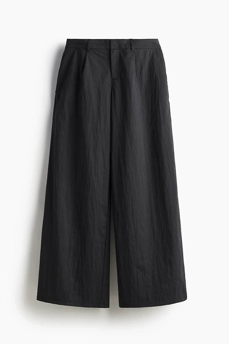 Loose-fit pants in woven crêpe fabric with pleats at front. Zip fly with hook-and-bar fastener, diagonal side pockets, and mock back pocket flaps. Wide legs.