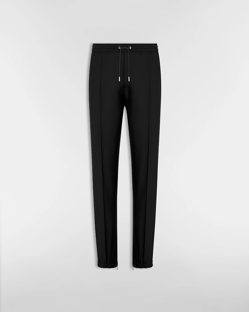 The tailored track pants are crafted in striped blue wool twill. They have a drawstring elastic waistband and zip closures at the ankles. The front and rear darts lend structure and precision to the silhouette. The track pants can be paired with CD Icon sweatshirts for a relaxed and iconic look.