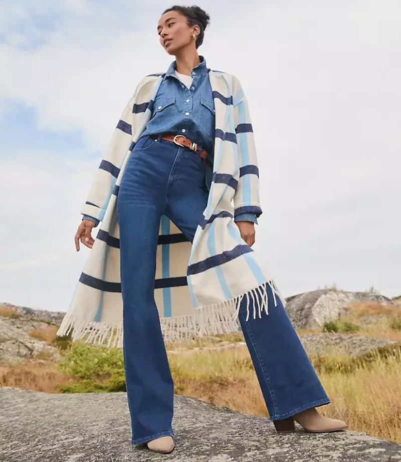 Pants Details: Front zip with button closure. Belt loops Five pocket styling., Leg Shape: Flare - fitted through the hip and thigh, relaxing just above the knee into a flare leg, Rise: Sits at high waist, 12"rise, Imported:, Fit: A modern classic, with a waist - flattering high rise in perfectly stretchy denim, Length: Full length, 35"inseam Loft Tall High Rise Slim Flare Jeans in Dark Wash Size 24 Women's by Loft Size Regular - 24 Dark Wash Women's Regular, Pants