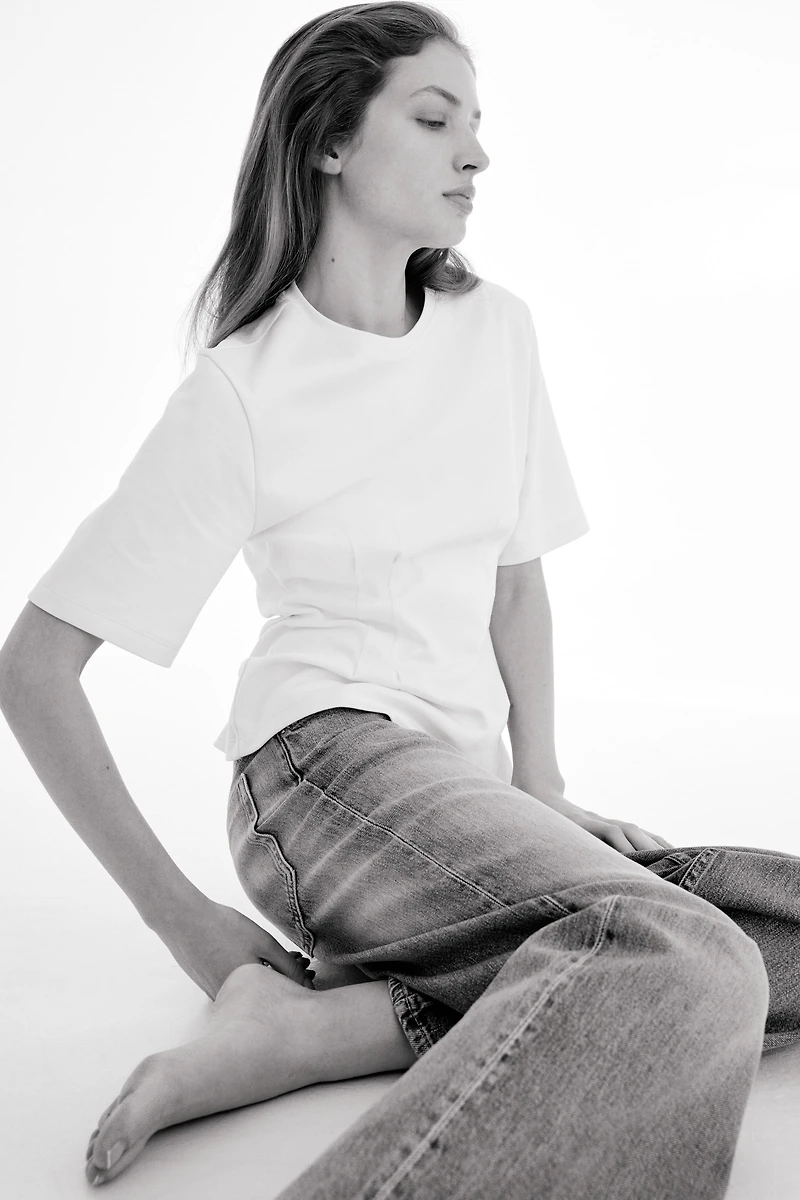 Long T-shirt in thick interlock jersey. Shaping darts at front of waist for a tapered silhouette. Round neckline.