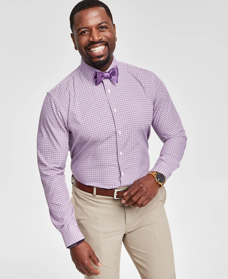A powerhouse showcase of wrinkle-free, moisture-wicking design that leaves room for a hint of stretch, this slim-fit button-down from Tayion Collection comes complete with an intricate purple and white plaid pattern.