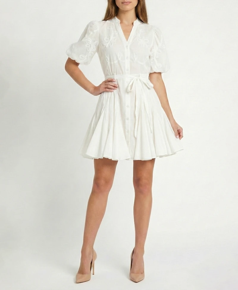 Crafted from comfortable cotton and styled with front button closures for added versatility, Taylor's petite fit and flare dress stands apart with its elegant soutache scrolling and charming short puff sleeves.