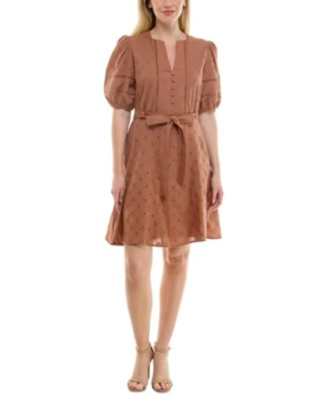 London Times Women's Puff-Sleeve Tab-Detail Fit & Flare Dress