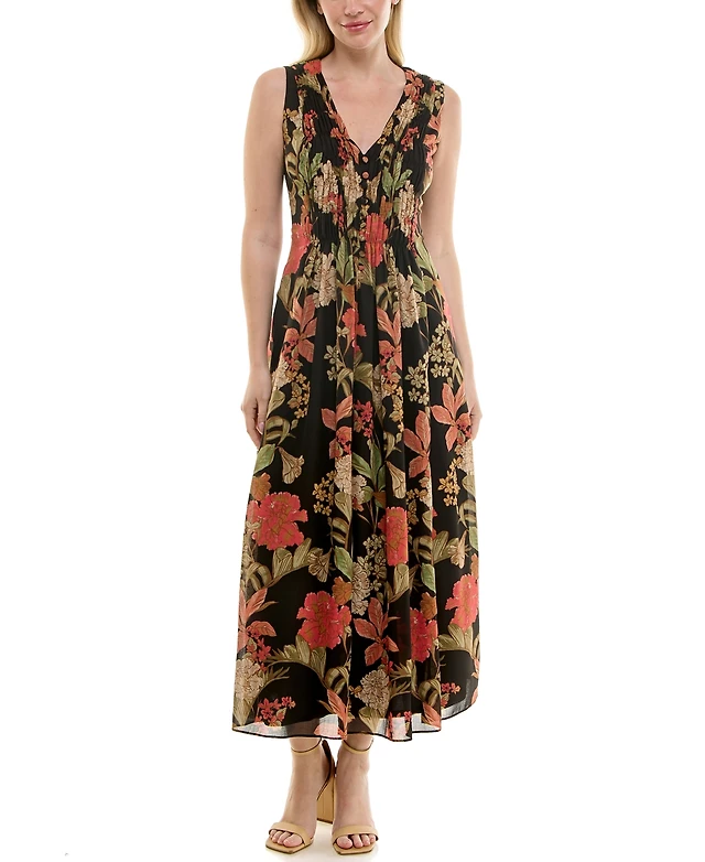 Taylor Women's Printed V-Neck Smocked-Waist Sleeveless Dress