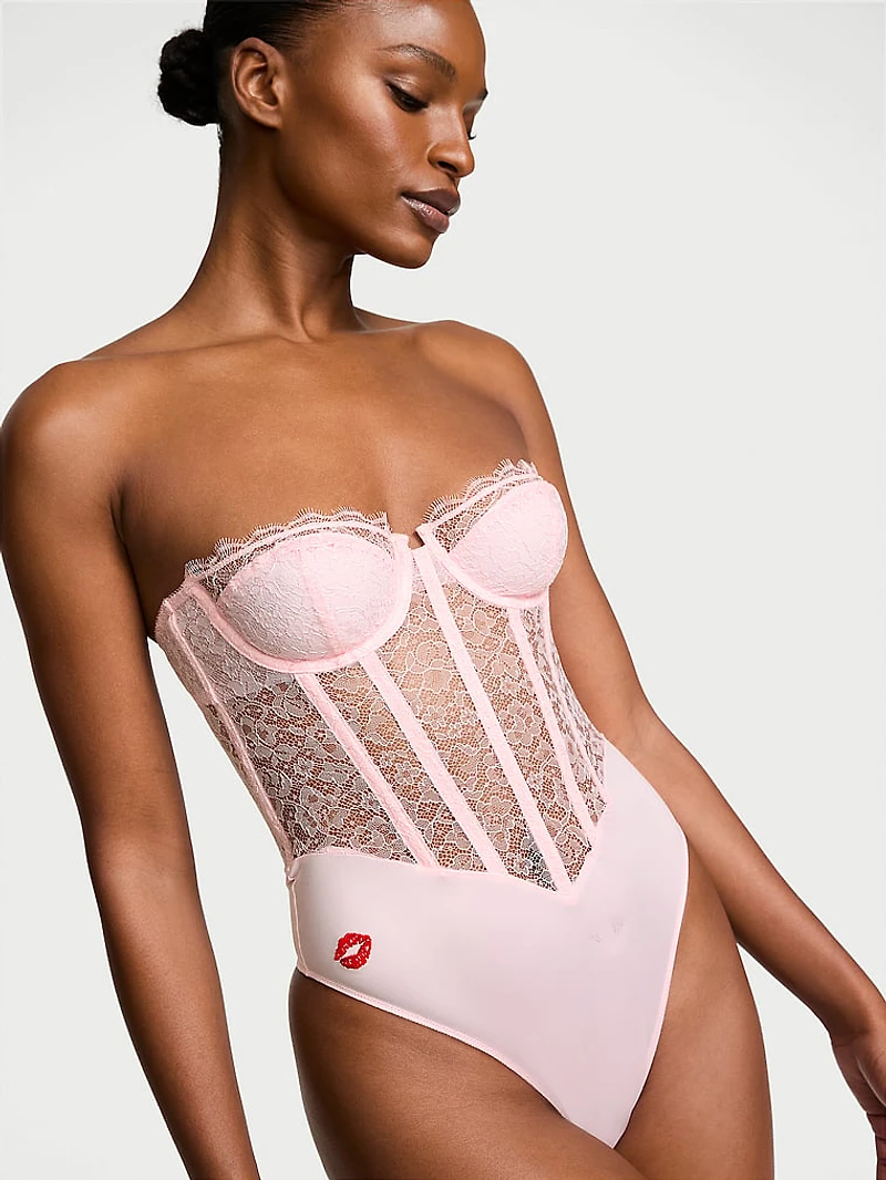 Sweet and sexy, this Corset Bodysuit pairs our striking, logo-detailed lace with smooth, comfy microfiber to create a easy-wear, standout design. Flexible boning shapes the silhouette, while the invisible zipper makes for easy on and off. It's all sealed with a kiss—a playful pout embroidered on the side.