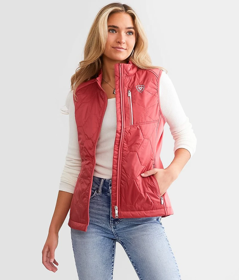 Embroidered logo zip down lined vest Interior pouch pocket Wind and water resistant Bust measures 36" on size small Body length 23 1/2" on size small