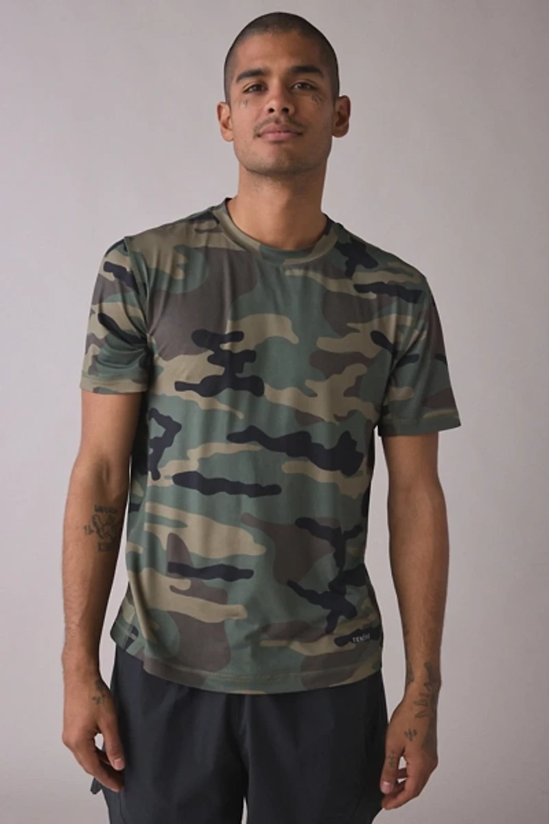 Running tee by TENORE in a sweat-wicking stretch fabrication. Camo pattern t-shirt with a crew neck and short sleeves. Workout-ready tee to pair with your favorite shorts and more.