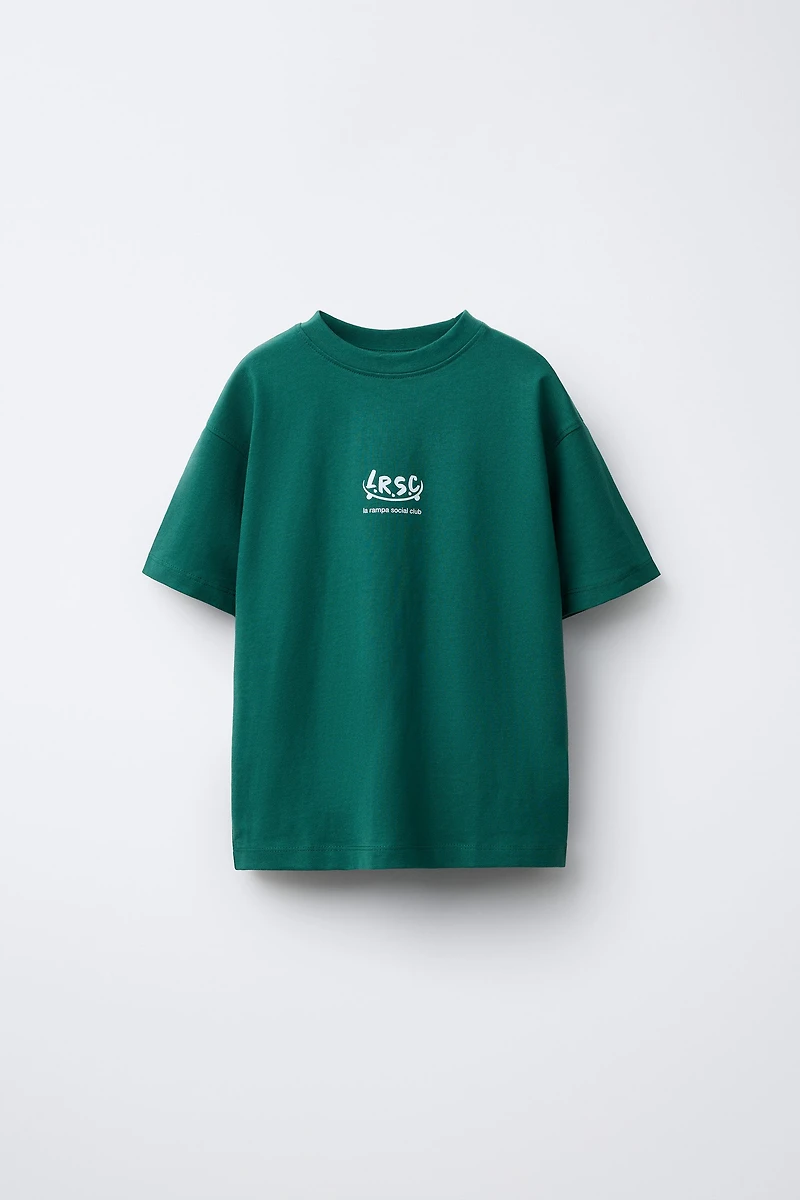 Round neck, short sleeve T-shirt with text print on the front and back.