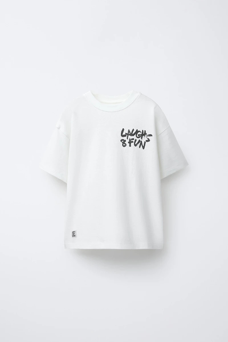 Round neck, short sleeve T-shirt. Text print on the chest and back. Label appliqué on the hem.