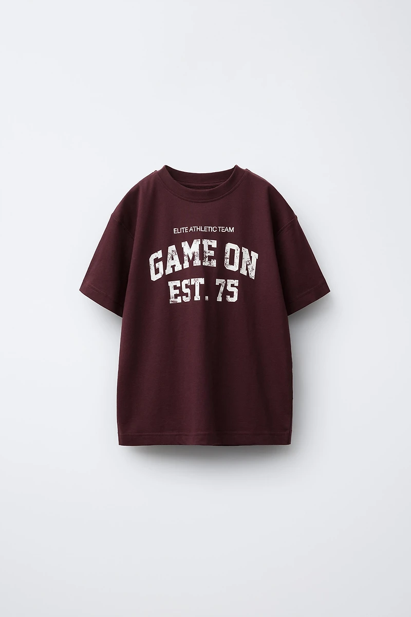 Round neck short sleeve T-shirt. Text print on the front. 100% cotton fabric.