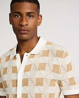 A short sleeve sweater polo complete with a point collar, a full button front, and a textured check print.